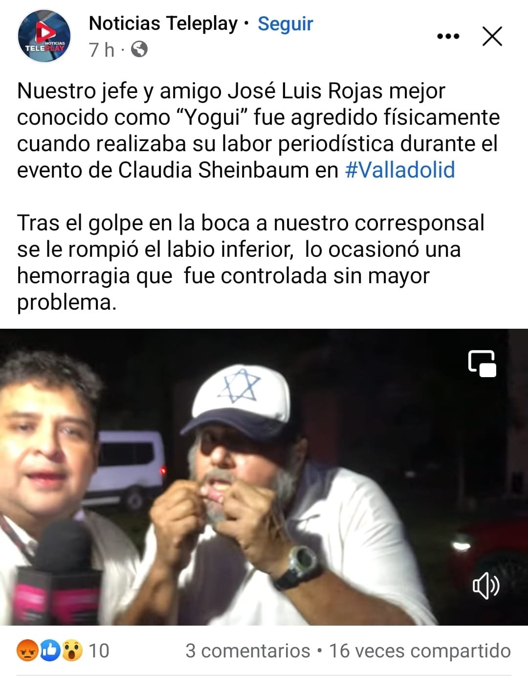 Se trata de José Luis Rojas Sarlat, director general de la casa productora Teleplay y reciente colaborador del medio nacional LatinUs, quien recibió un puñetazo en la boca por parte del personal de Sheinbaum sin motivo, solo por el hecho de tener la marca LatinUs. Y “por estar haciendo mi trabajo” como señaló el propio trabajador yucateco.