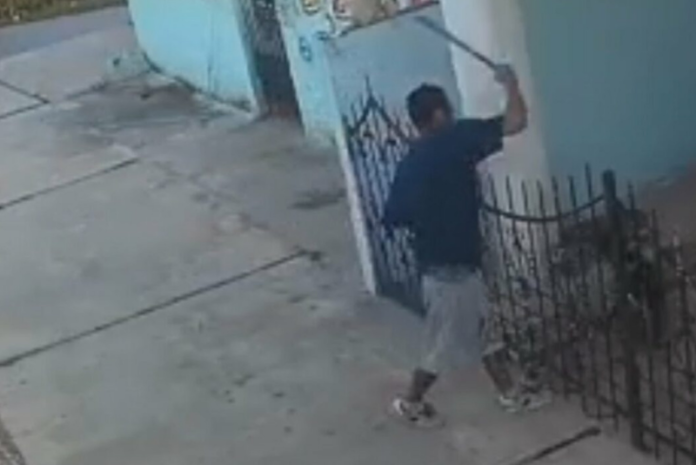 Una cámara de vigilancia captó el momento en que el presunto delincuente que suma ya una larga lista de asaltos a mano armada estaba dispuesto a entrar a un predio; sin embargo, el perro con sus alterados ladridos impidió que este cometiera el delito, por lo que regresó con un machete y atacó al anima.