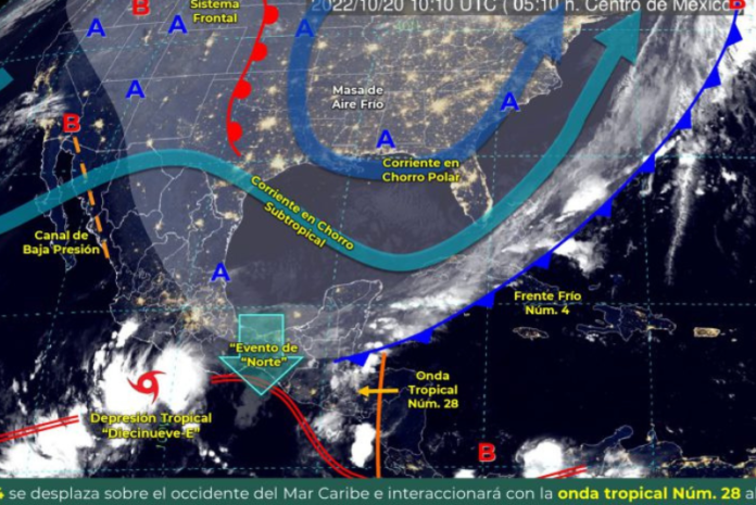 Para el día de hoy, el Frente Frío Núm. 4 se desplaza sobre el occidente del Mar Caribe e interaccionará con la Onda Tropical Núm. 28 al sur de la Península de Yucatán, ocasionarán lluvias puntuales intensas en Chiapas y Tabasco, muy fuertes en Campeche, fuertes en Quintana Roo y chubascos en Yucatán, reporta el Servicio Meteorológico Nacional (SMN).