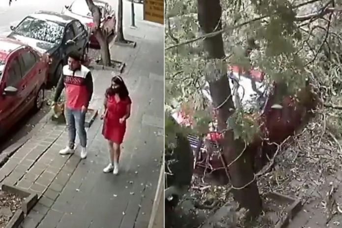A través de Twitter, el usuario @Davidelvaca compartió un video donde se ve a una pareja caminar por calles de la colonia Juárez, cuando al percatarse que un árbol estaba a punto de colapsar corrieron para salvar sus vidas; sin embargo, al caer dañó un par de vehículos.
