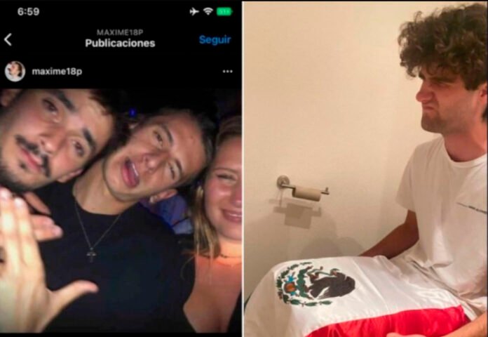 En otra de las imágenes que más molestia causó se puede apreciar a uno de los franceses usando la bandera de México mientras va al baño.