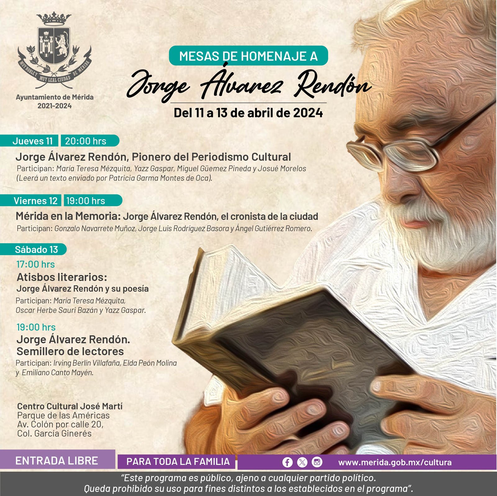 En homenaje a quien fuera cronista de Mérida, escritor, poeta y periodista cultural, el ayuntamiento de Mérida, a través de la Dirección de Cultura, inicia un ciclo de homenajes al Mtro. Jorge Álvarez Rendón. Serán cuatro eventos en el Centro Cultural José Martí, comenzando hoy a las 20:00 horas, con la mesa redonda “Jorge Álvarez Rendón, pionero del periodismo cultural”.