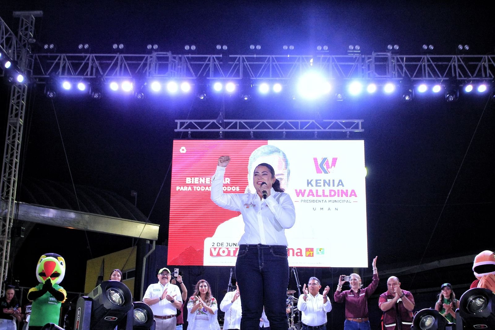 Umán, Yucatán, 25 de mayo de 2024.- En un emotivo cierre de campaña, más de 5,000 ciudadanos de las 17 comisarías, colonias y fraccionamientos de Umán se congregaron para escuchar a Kenia Walldina Sauri Maradiaga, la candidata a la alcaldía por la coalición conformada por MORENA, PT y PVEM. La candidata reiteró su compromiso de ser una voz para todos, enfocando sus esfuerzos en las comisarías para asegurar que el bienestar y el progreso sean accesibles para cada umanense.