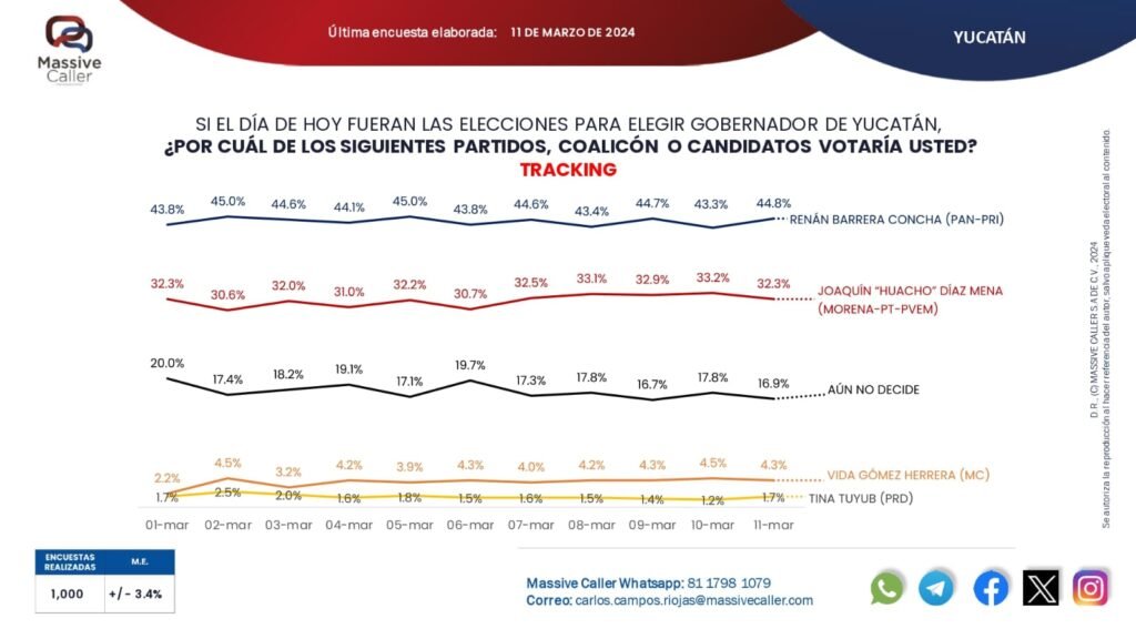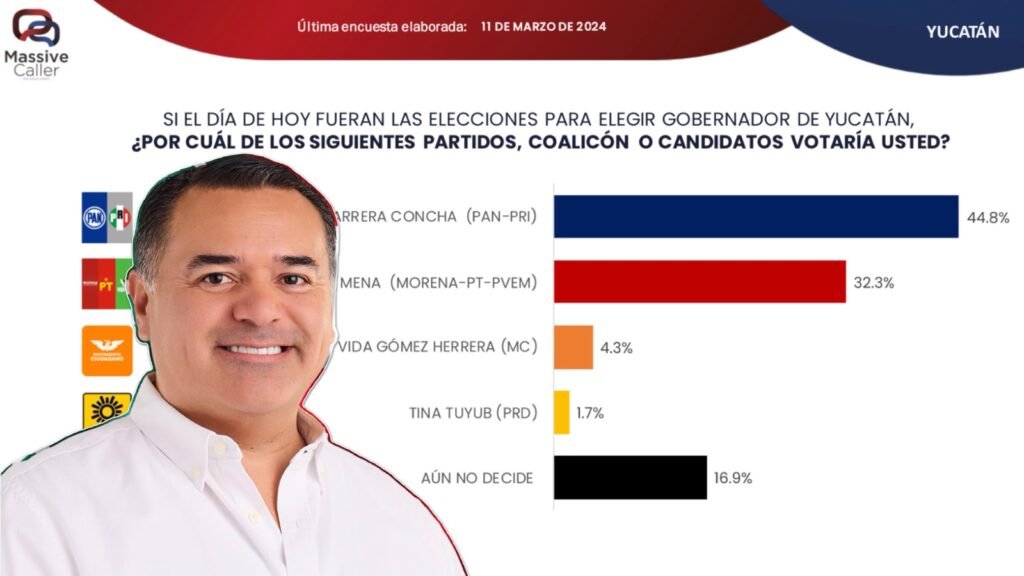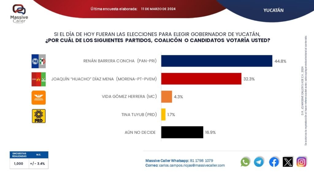 La firma Massive Caller difundió este martes su más reciente fotografía del proceso electoral 2024 para la gubernatura de Yucatán, la cual arrojó que si hoy fueran las elecciones Renán Barrera Concha se alzaría con la victoria con más de 10 puntos de diferencia sobre su más cercano competidor.