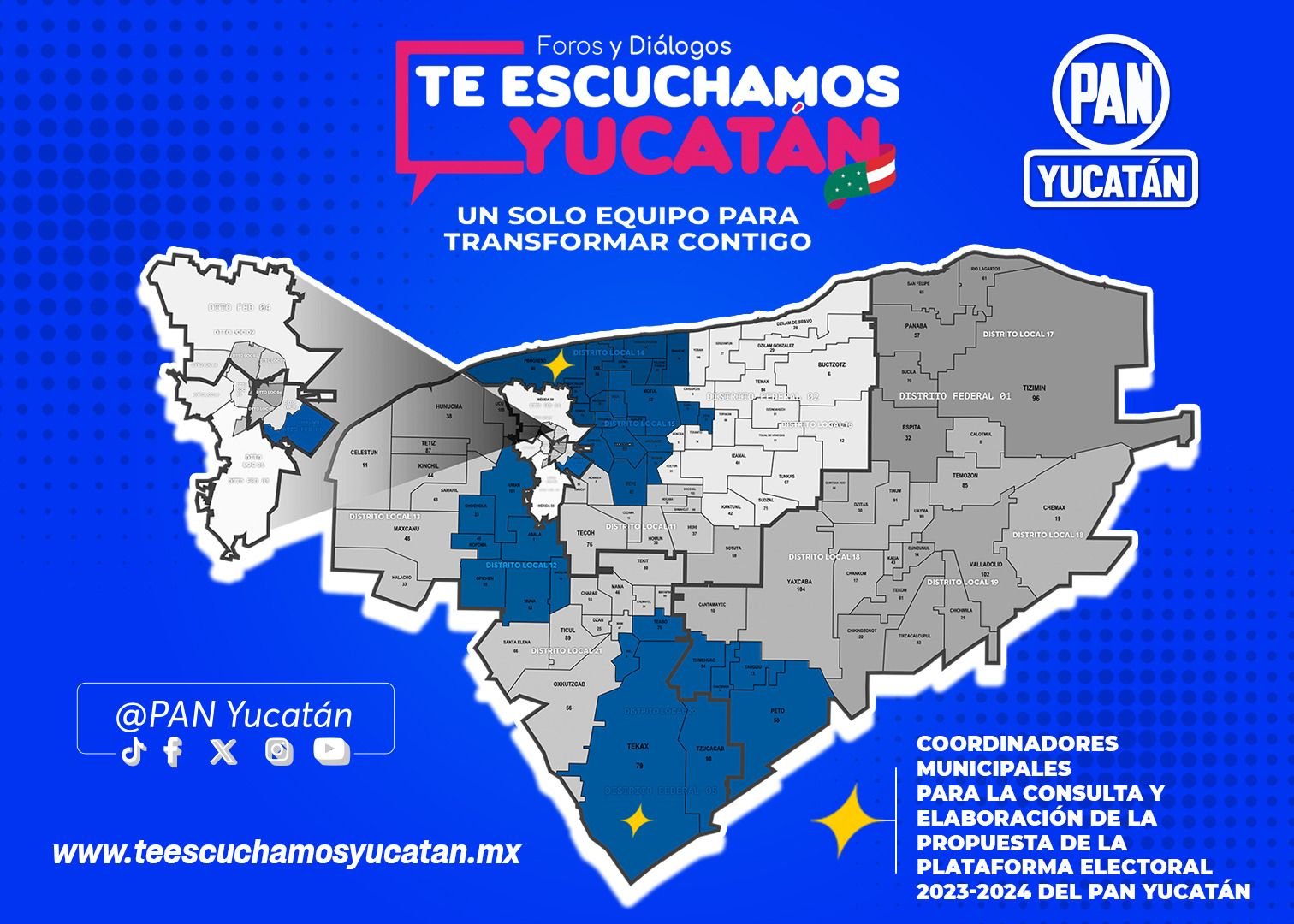 El Partido Acción Nacional (PAN) de Yucatán se encuentra en pleno proceso de escuchar y comprometerse con la voz de los yucatecos, a medida que elabora su plataforma política de cara a las elecciones del 2024. Bajo la iniciativa “Te Escuchamos Yucatán”, el PAN ha emprendido una serie de foros en diferentes municipios y ha lanzado el micrositio teescuchamosyucatan.mx, con el objetivo de unir esfuerzos en la construcción de un Yucatán mejor para el futuro.